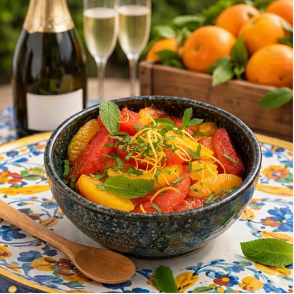 5. Versez le sirop tiède avec les zestes confits sur les fruits, puis mélangez très délicatement pour ne pas casser les suprêmes.